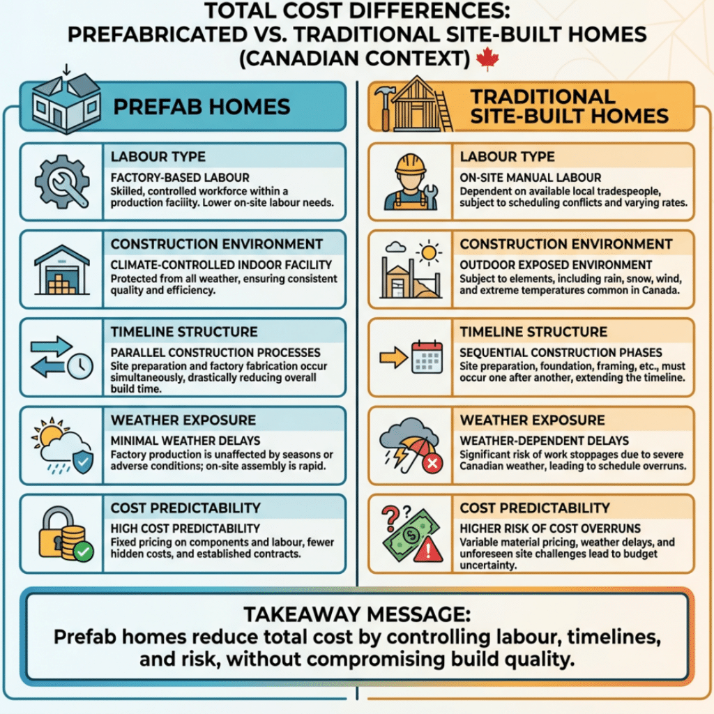 In most cases, prefab homes cost less in Canada when total project costs are compared. The difference becomes more pronounced in high-labour-cost regions like Ontario and British Columbia. Prefab construction consistently delivers better cost control.
