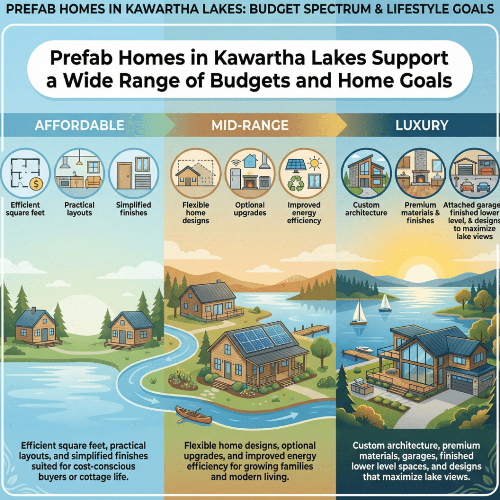 Buyers can find a wide range of prefab homes in Kawartha Lakes, from affordable entry-level homes to high-end luxury builds.