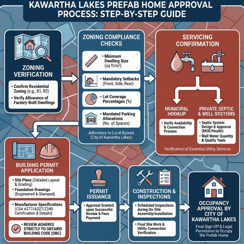 Building permits are issued by the City of Kawartha Lakes after zoning compliance is confirmed. Applications typically require site plans, foundation drawings, manufacturer specifications, and proof of compliance with the Ontario Building Code, including CSA standards for factory-built homes.